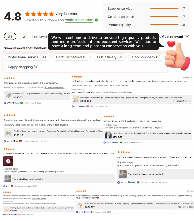 1. Teljes kategória lefedettség, széles választék, nagy mennyiségű raktárkészlet, testreszabás támogatása 2. Szakértői ékszertervező csapat: klasszikus modellek/divatos modellek/stílusjellemzők rendszeresen frissülnek