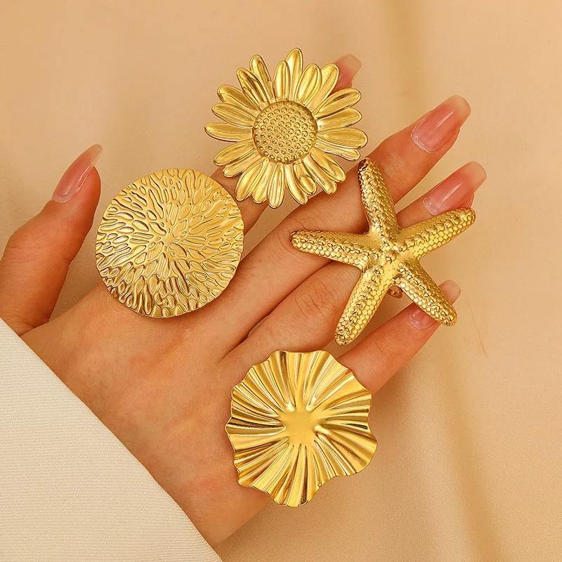 Ez a gyűrű lenyűgöző, a tenger és a természet ihlette dizájnnal rendelkezik. A csillagalakot egy hangsúlyos napraforgó-textúrával kombinálták, így merész és művészi megjelenést kapva. A szabálytalan geometrikus minta kiemeli ezt a gyűrűt az átlagos ékszerek közül, ideálissá téve mindazok számára, akik szeretnek különleges és más jellegű darabokat viselni. A nyitott gyűrűkialakítás könnyű állíthatóságot biztosít, így kényelmes illeszkedést nyújt különböző ujjméretekhez.