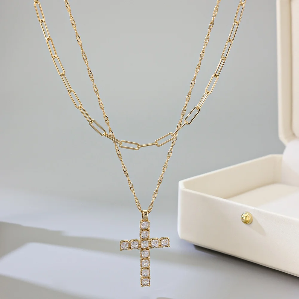 Introducing the HQCMLA 2025 Summer New Double-Layer Overlapping Cross Pendant Necklace Micro-Inlaid Rhinestone Alloy Link Chain Cross-Border Wear - a stunning and fashionable accessory that is perfect for adding a touch of elegance to any outfit