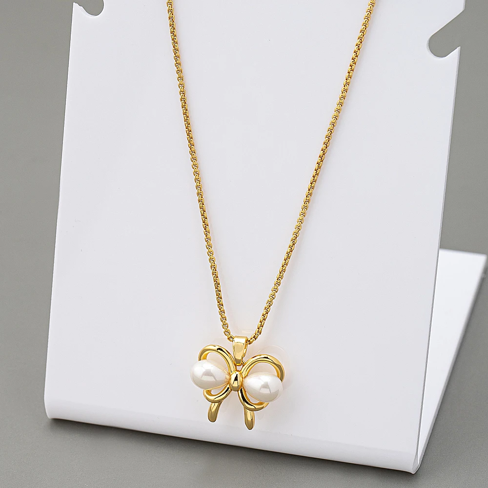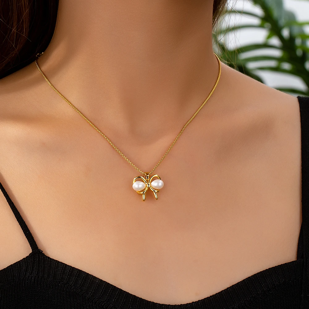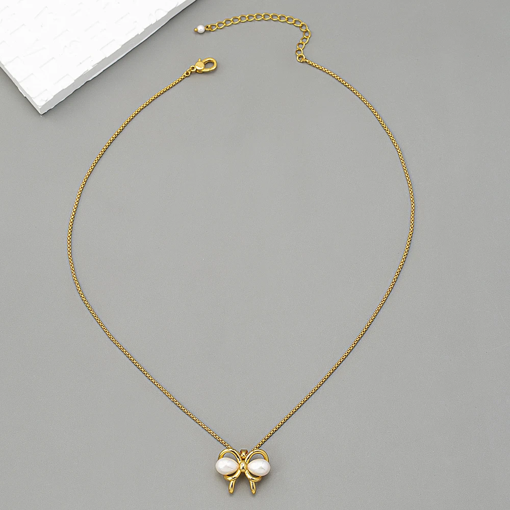 2026Wholesale Fashion Accessories Timed Light Luxury Gold Brass Butterfly Imitation Pearl Charm Pendant Women's Party Necklace