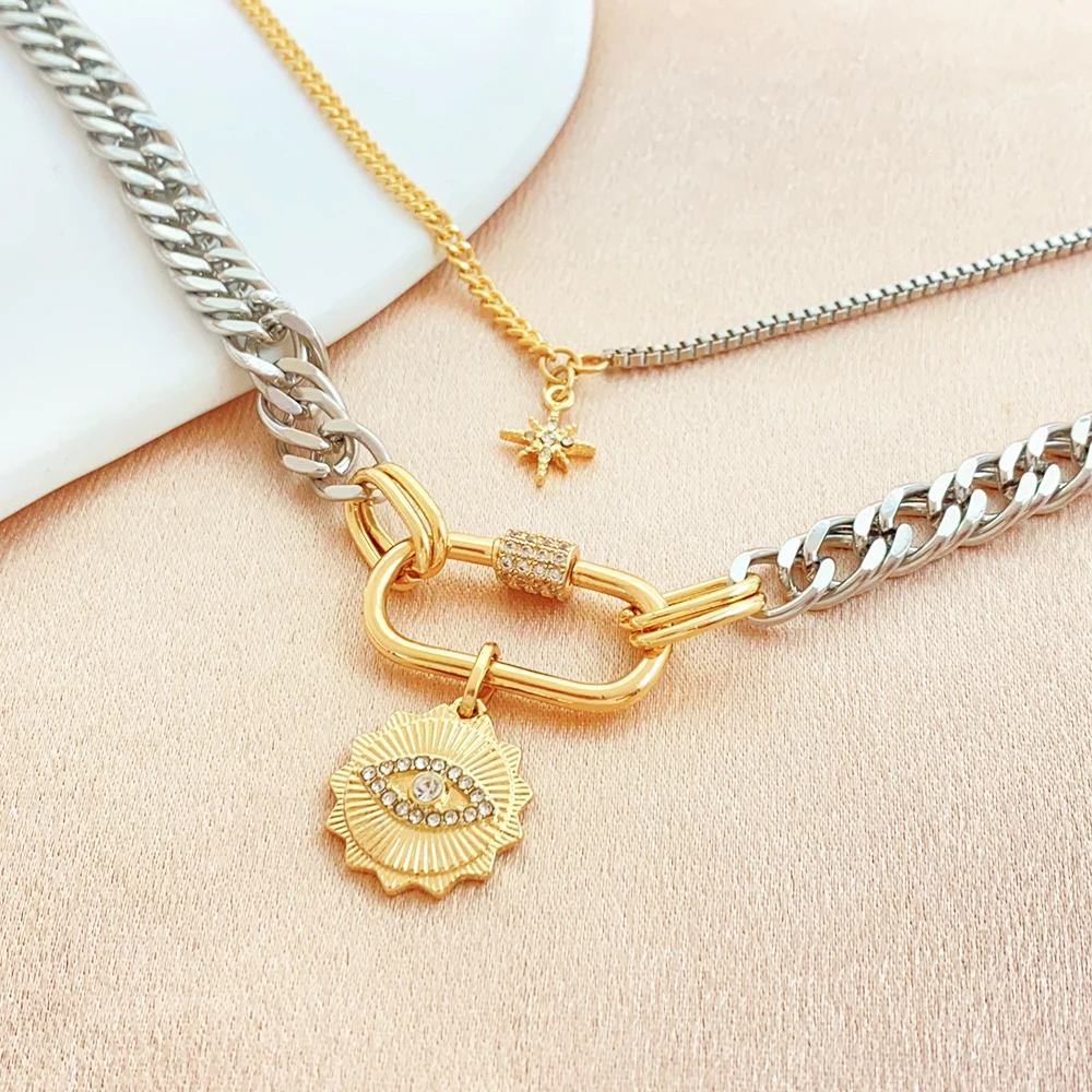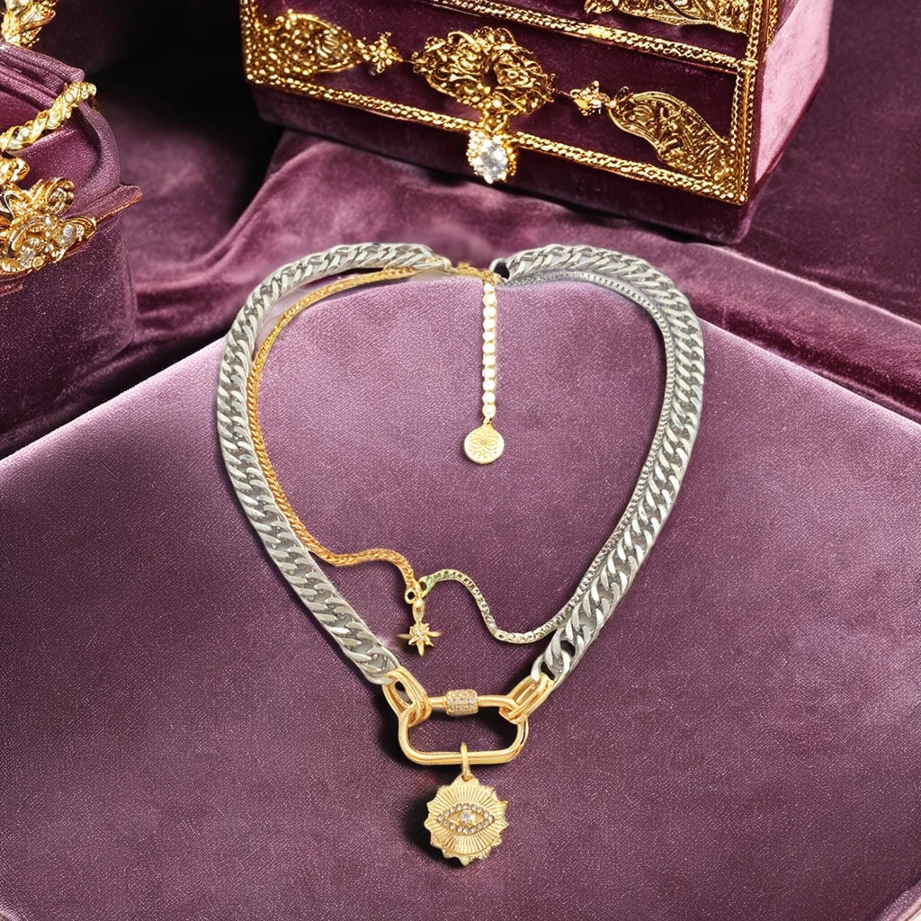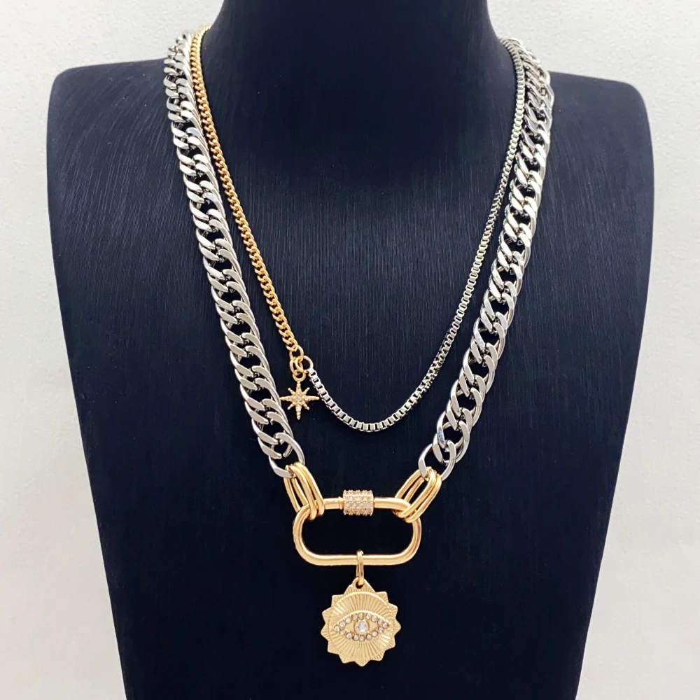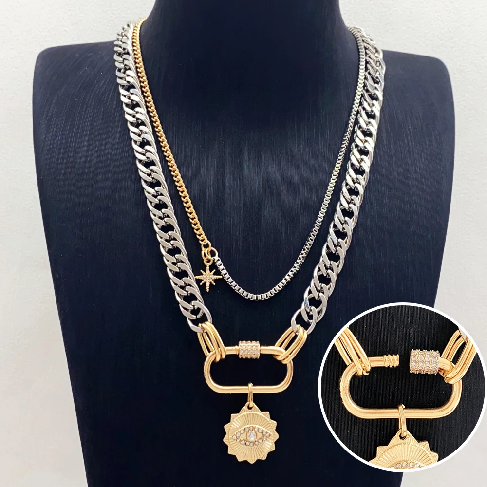 The necklace also includes a unique carabiner clasp, making it easy to put on and take off. This practical feature adds a cool and contemporary edge to the jewelry while ensuring it stays securely fastened. The double layer chains complement each other, adding depth and interest to your look without being too flashy.