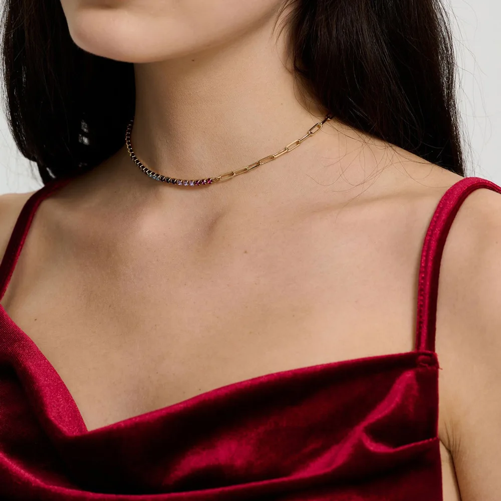 Fashion Jewelry Wholesale Classic Zinc Alloy Link Chain Custom Colorful Crystal Pink Pendant Gold Plated Necklace for Women