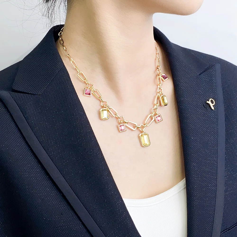 Fashion Jewelry Wholesale Classic Zinc Alloy Link Chain Custom Colorful Crystal Pink Pendant Gold Plated Necklace for Women