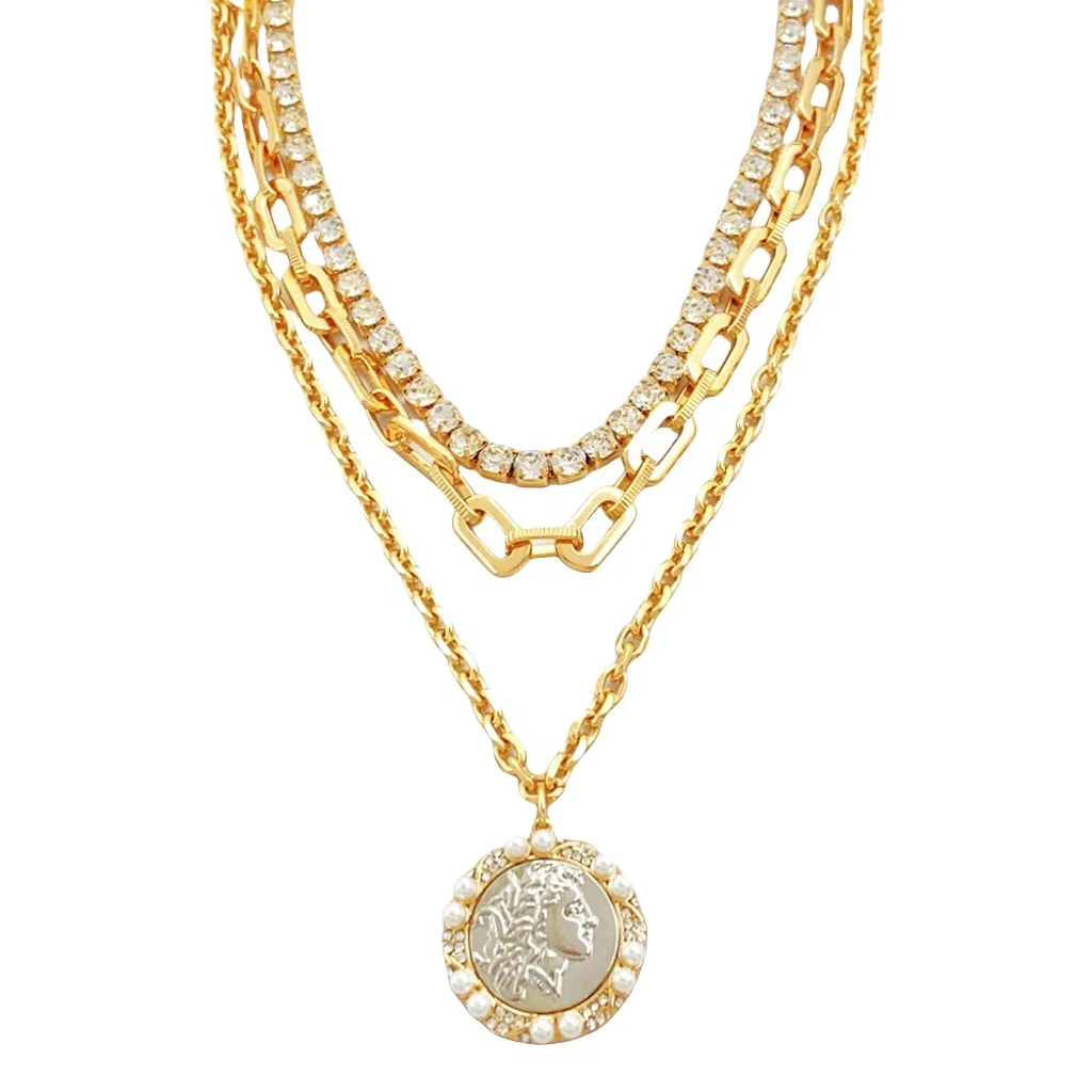 Introducing, the HQCMLA Women's Multi-Layer Gold Link Chain Pearl Crystal Necklace Earring Set, the must-have accessory that will elevate any outfit to the next level. This stunning set features a beautiful cameo pendant that adds a touch of vintage charm to the modern design.
