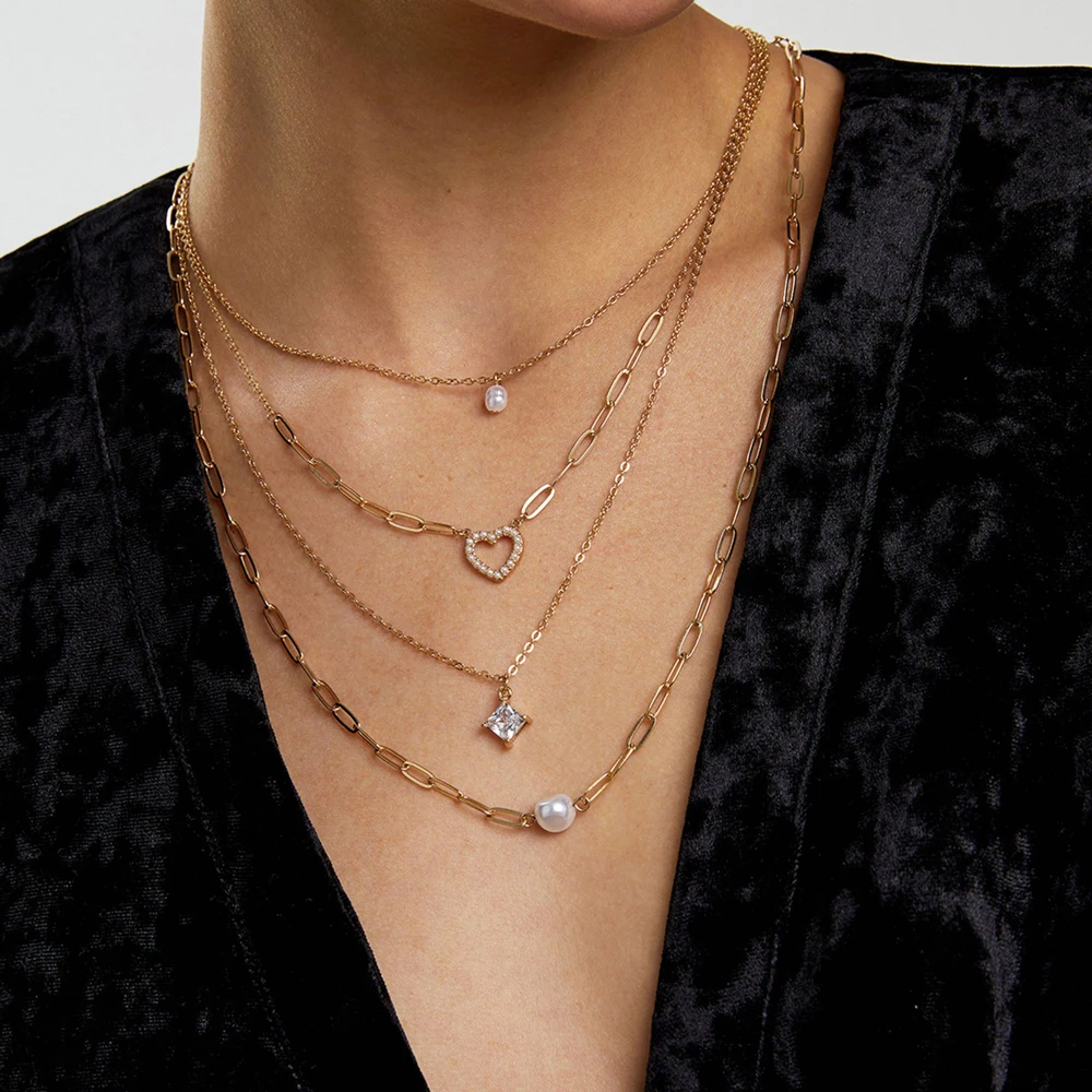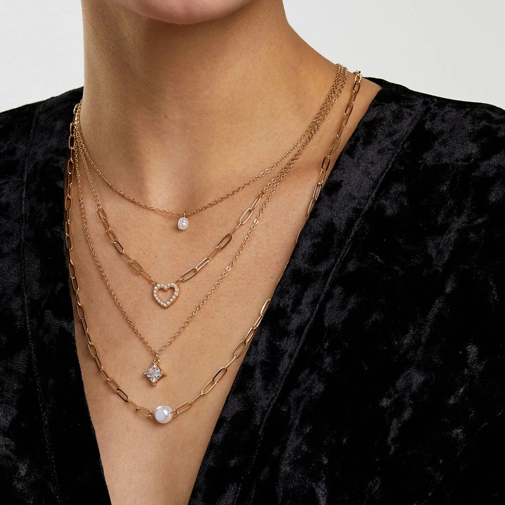 Hot Selling Layered Heart Inlaid Pearl Geometric Fashionable Elegant Accessories High-end Jewelry Necklace for Women