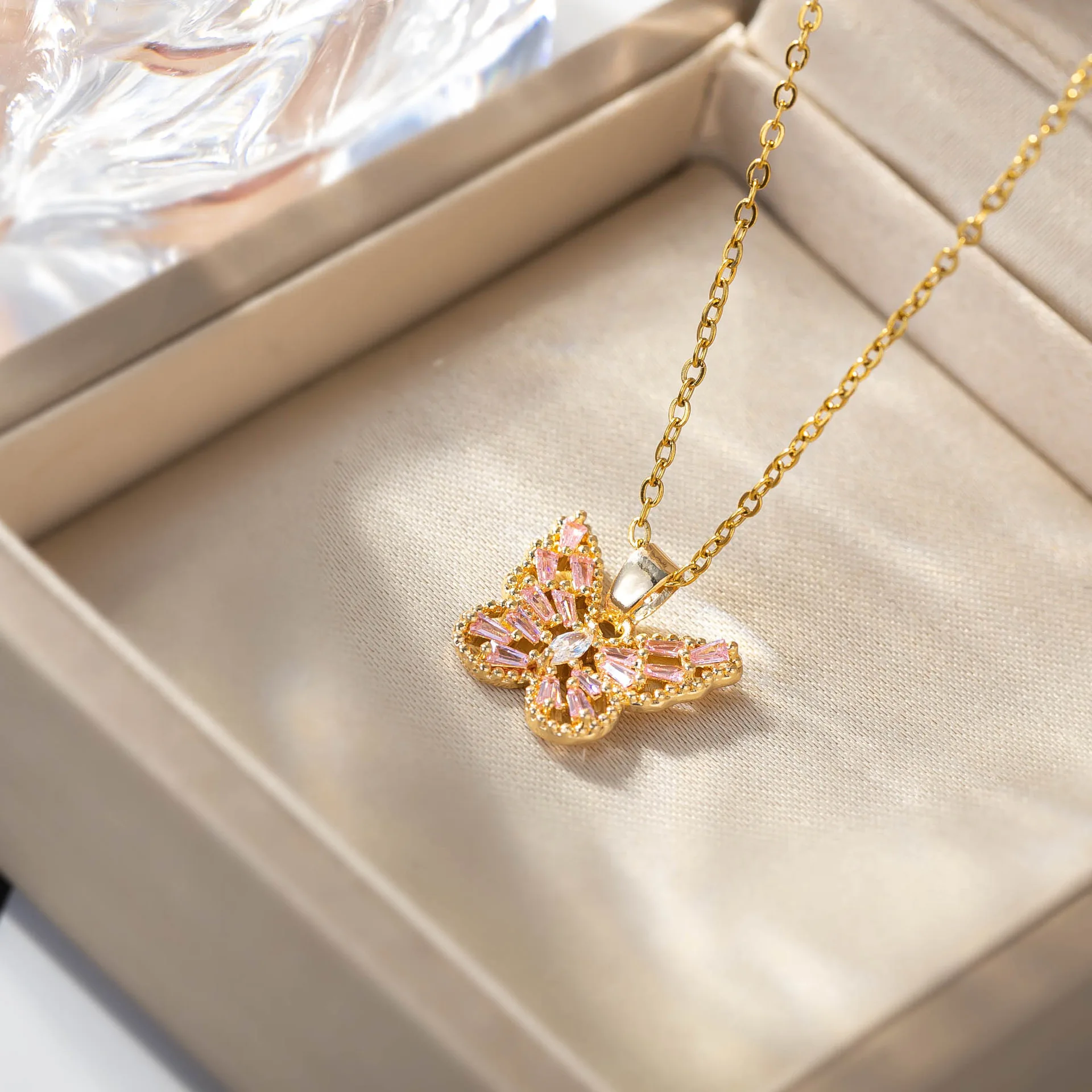 Crafted from high-quality gold stainless steel, this women's necklace is both durable and stylish, making it the perfect addition to your jewelry collection. The butterfly pendant is adorned with colored rhinestones and glass, giving it a unique and elegant look that is sure to turn heads.