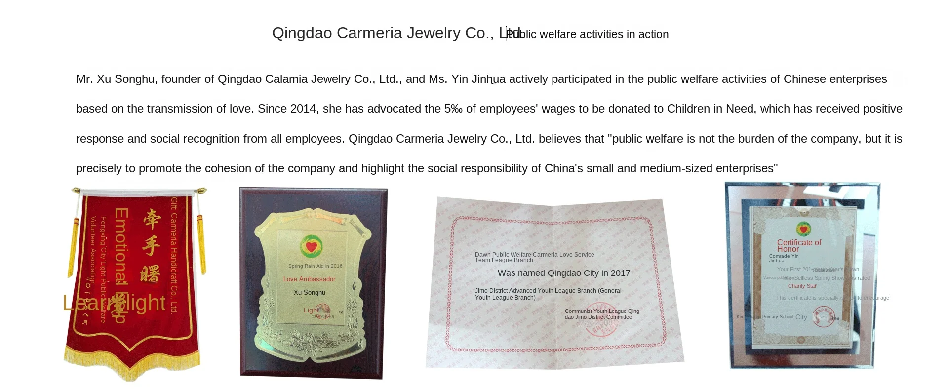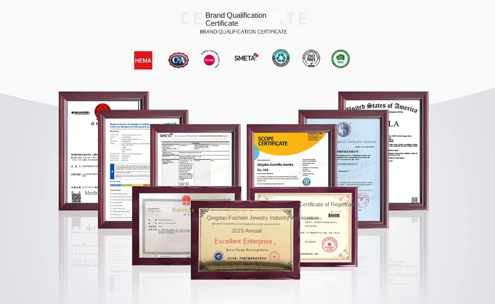 A Qingdao Camellia Jewelry Co., Ltd, fundada em 2003, é uma empresa profissional de joias fashion com mais de 200 trabalhadores experientes e área de 3000 metros quadrados. Atuamos no setor de joias há mais de 18 anos, especializados em joias fashion de imitação. Nossos produtos incluem anéis, brincos, colares, pingentes, tornozeleiras, pulseiras, conjuntos de joias, etc. Quatro designers coreanos lideram mais de 25 funcionários na equipe de desenvolvimento, criando mais de 1500 novos produtos mensalmente. Com profissionais experientes e instalações completas nas áreas de materiais, produção e controle de qualidade, nossa empresa passou pelas inspeções de fábrica da HEMA, C&A, BSCI e possui o certificado conforme a norma GB/T19001-2008/ISO9001:2008. Nossos produtos são bem vendidos na América do Norte, Europa, América do Sul, Ásia Oriental e Austrália. As exportações anuais da empresa atingiram 6 milhões de dólares americanos. Recebemos grande reputação de nossos clientes, graças à excelente qualidade, preço justo, entrega rápida e serviço perfeito. Paralelamente, com senso de responsabilidade social, destinamos 1% do lucro anual para ações de caridade nos últimos 18 anos. "Criar beleza, iluminar felicidade, retribuir à sociedade" é o nosso slogan.